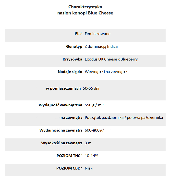 Blue Cheese to nasiono konopi, która dojrzewa, gdy poświęci się jej trochę uwagi. W rzeczywistości, standardowa dieta i sekwencja czasowa nawadniania wystarczyłyby, aby rosła silna i energiczna. Jako jeden z jej głównych atutów możemy wymienić jej niesamowitą zdolność radzenia sobie z wilgocią i plagami. Kiedy zdarzy im się uderzyć w pestkę, nie cofa się, ale walczy z nimi z odwagą.