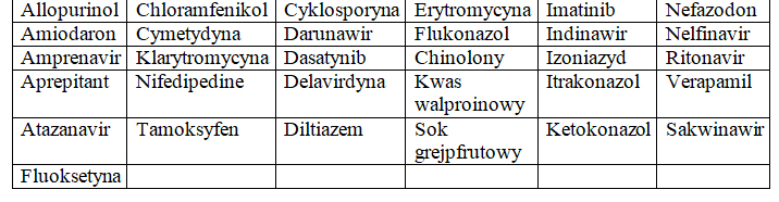 Inhibitory proteazy i loperamid to przykłady silniejszych inhibitorów CYP34. Bardziej umiarkowane to amiodaron, werapamil, aprepitant i cymetydyna.