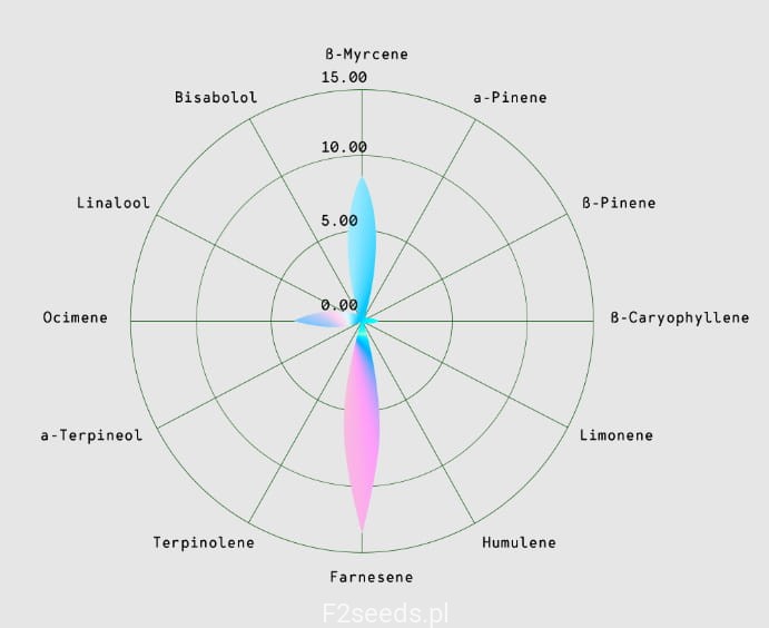 Medusa F1 to bardzo aromatyczna odmiana nasion marihuany o zapachu świeżej mięty, z wyraźnym dodatkiem pieprzu i nutami świeżych owoców, jagód i paliwa. Jej grube, oszronione owoce kolekcji niezmiennie wytwarzają wysoki poziom THC i CBG, a także wysokie stężenia mircenu, ocymenu, farnezenu i kariofilenu. W rezultacie Medusa F1 ma silne działanie, które relaksuje i odurza ciało od stóp do głów (dzięki dużym ilościom mircenu i farnezenu), jednocześnie podnosząc na duchu i wzmacniając kreatywność i motywację (dzięki wysokiemu stężeniu ocymenu).